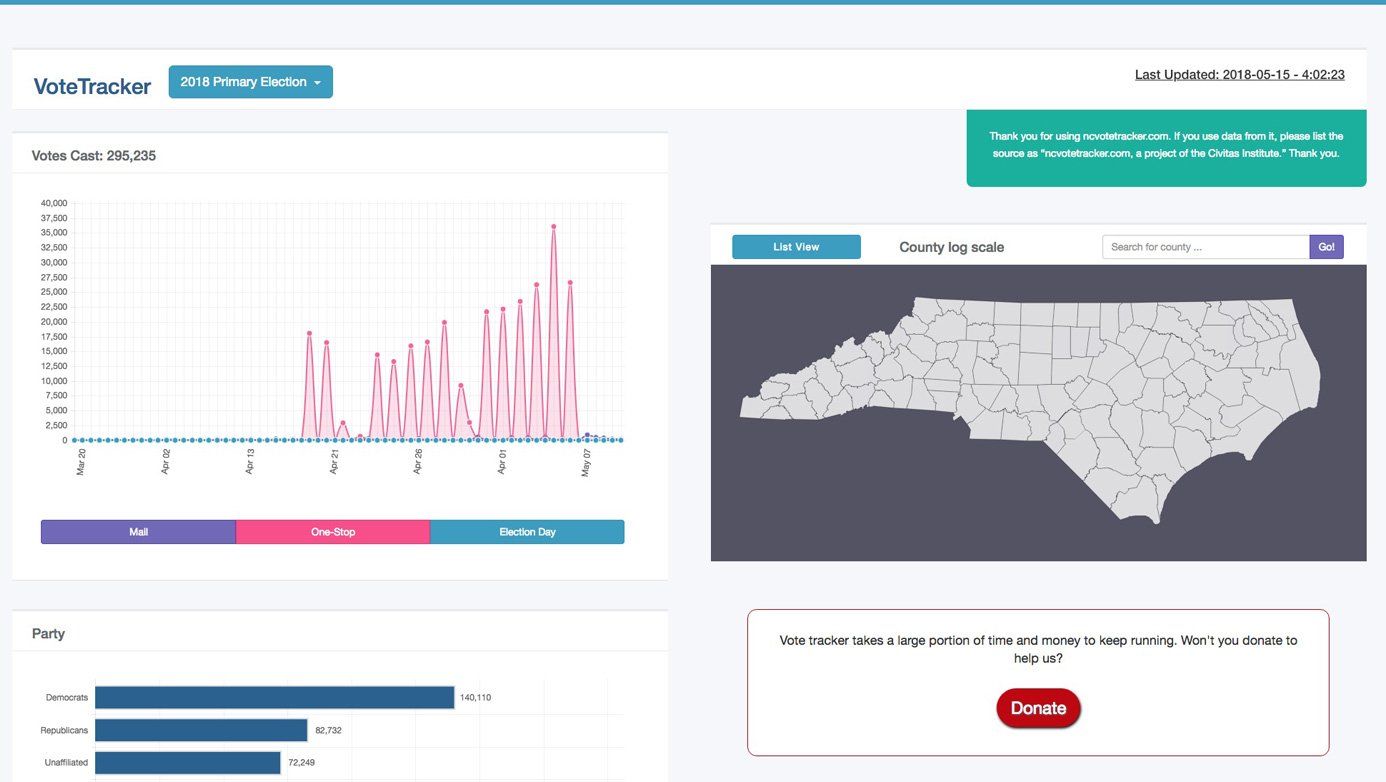 NC Vote Tracker is the user-friendly database at the Civitas Institute’s Carolina Transparency website that helps pundits, political junkies and ordinary people better understand turnout numbers for primary and general elections. First introduced in 2010, NC Vote Tracker allows us to break down the early voting data by party, age, gender, race, congressional and state legislative districts. The interactive graphs in the website allows visitors to visualize million rows of NC voting data easily. The upload form allows admins to map the data with the State Board of Elections and with a hit of a button it processes millions rows, cleans up the data and uploads it to their database.